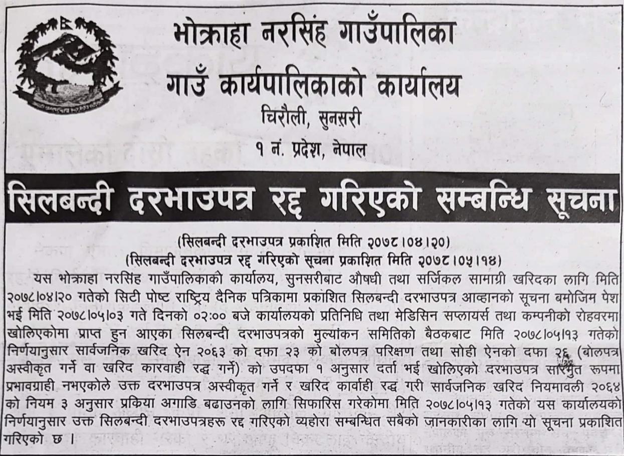 शिलबन्दि दरभाउपत्र रद्द गरिएको सुचना