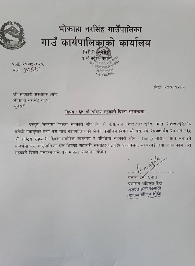 ६५ औ राष्ट्रिय सहकारी दिवस मनाउने सम्बन्धमा