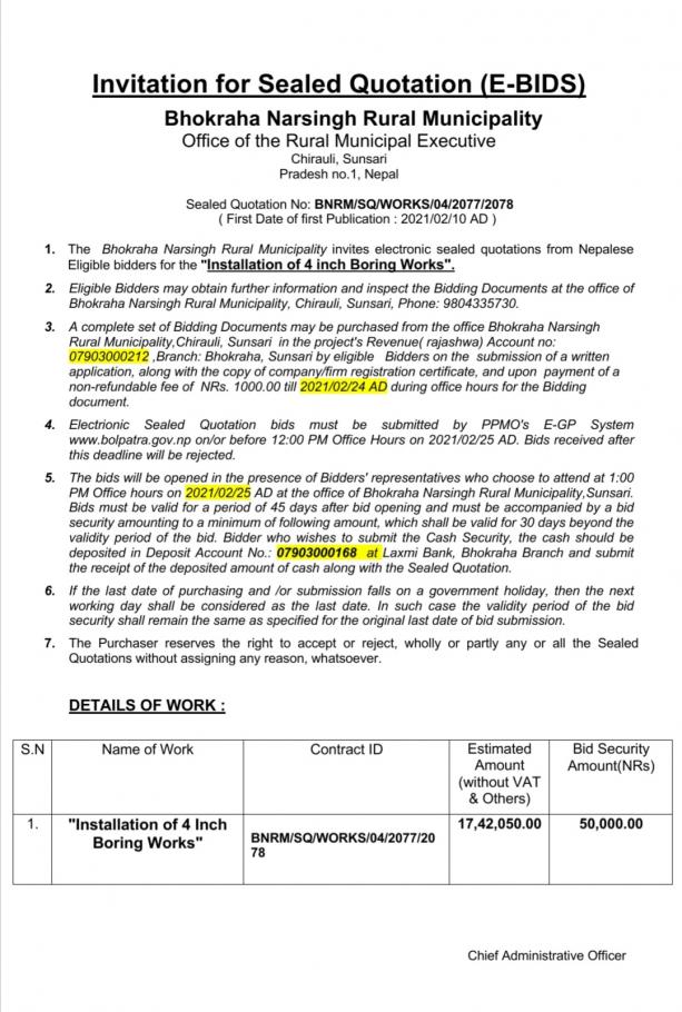 » Invitation for Sealed Quotation for installation of 4 inch Boring works